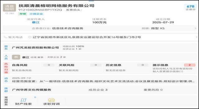 支撑这场骗局的,是三家看似关联紧密却疑点重重的公司。“清晨榕明”APP的运营主体为抚顺清晨榕明网络科技服务有限公司,该公司成立于2025年7月29日,注册资本100万人民币,法定代表人蔡江,由广州芃龙投资控股有限公司100%持股。而广州芃龙成立于2025年6月10日,注册资本仅50万,法定代表人蔡伟中,股东为广州华昇文化传媒服务有限公司(90%)与蔡伟中(10%),监事同样是蔡江。广州华昇则成立于2025年6月5日,注册资本50万,法定代表人马玉珍,监事蔡东泽,业务范围甚至包含“化工产品销售”。